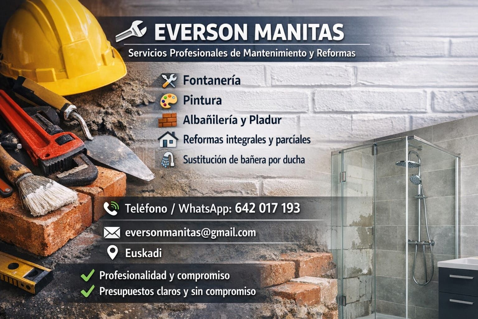En Everson Manitas, nos especializamos en el mantenimiento y reparación de siniestros, así como en reformas que transforman espacios. Nuestro equipo de expertos en albañilería está comprometido a ofrecer soluciones efectivas y de alta calidad, adaptadas a las necesidades de cada cliente. Con años de experiencia en el sector, garantizamos un servicio profesional y cercano, asegurando que cada proyecto se ejecute con precisión y atención al detalle. Tu satisfacción es nuestra prioridad, y trabajamos para que cada reforma sea un reflejo de tus deseos y necesidades.